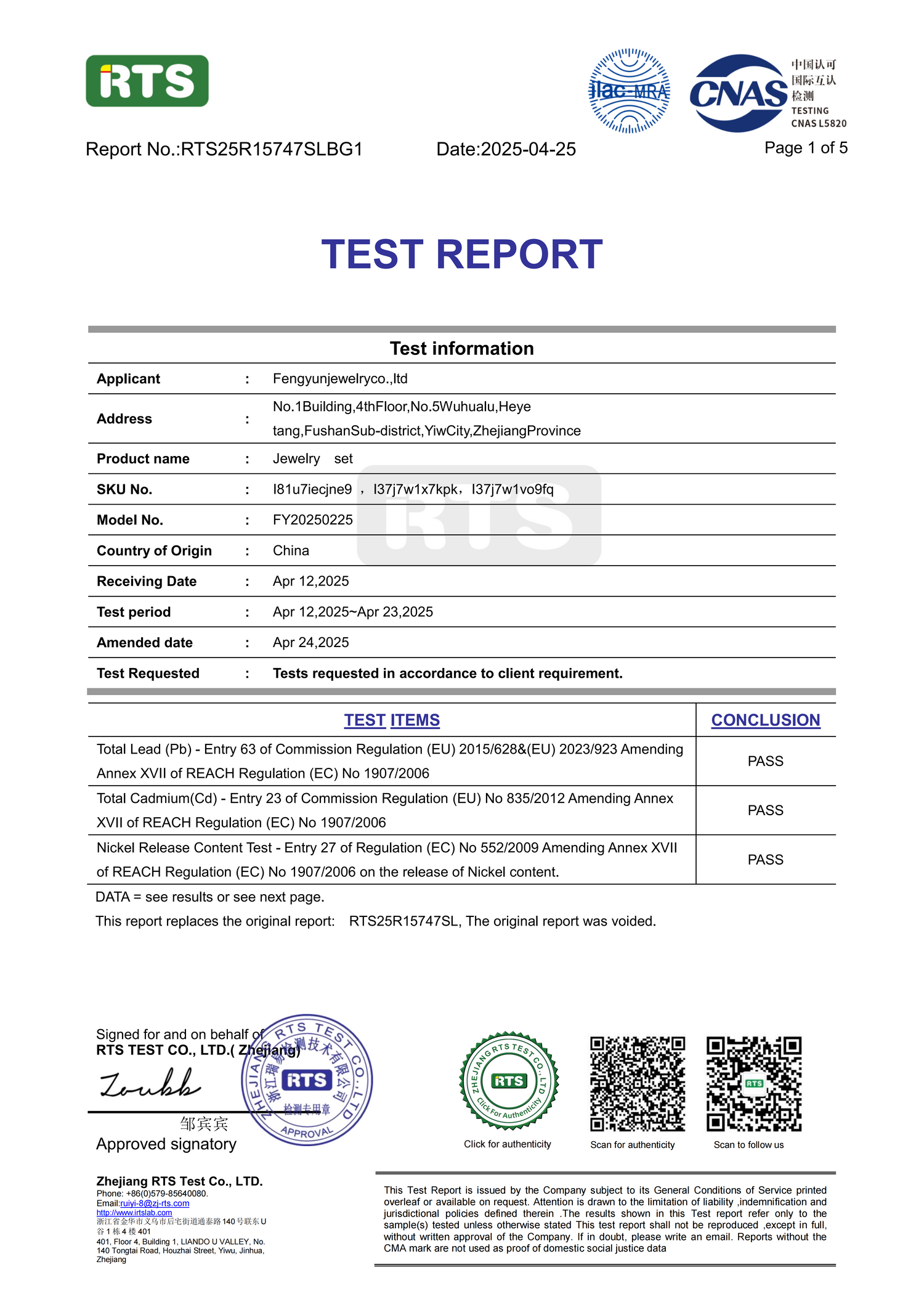 Every piece of jewelry you value undergoes rigorous testing by the internationally recognized authority RTS, fully complying with the most stringent safety standards of the EU REACH regulation.