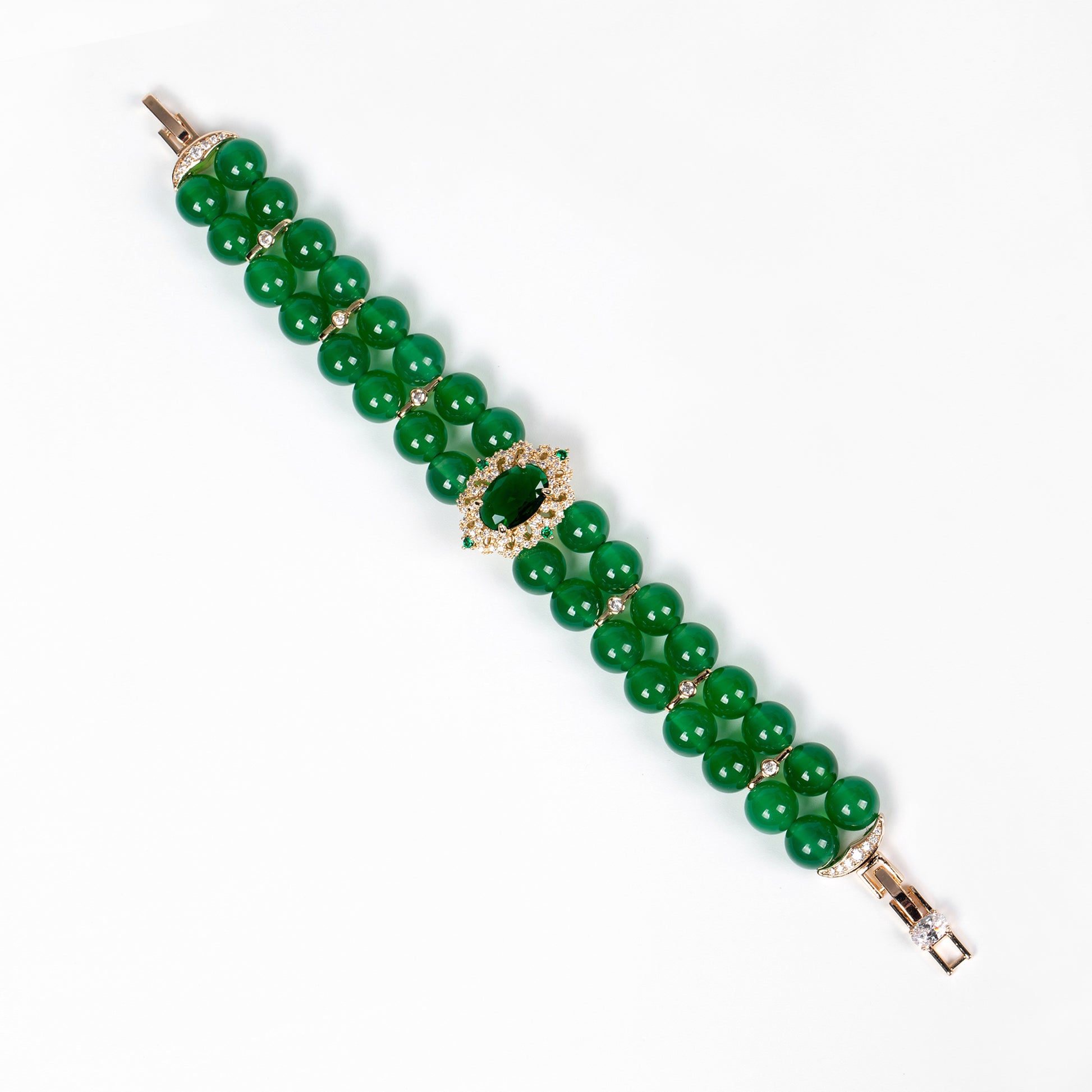 Double-Strand Green Gemstone Bracelet with Ornate Square Zircon Centerpiece & Gold-Tone Copper Clasp