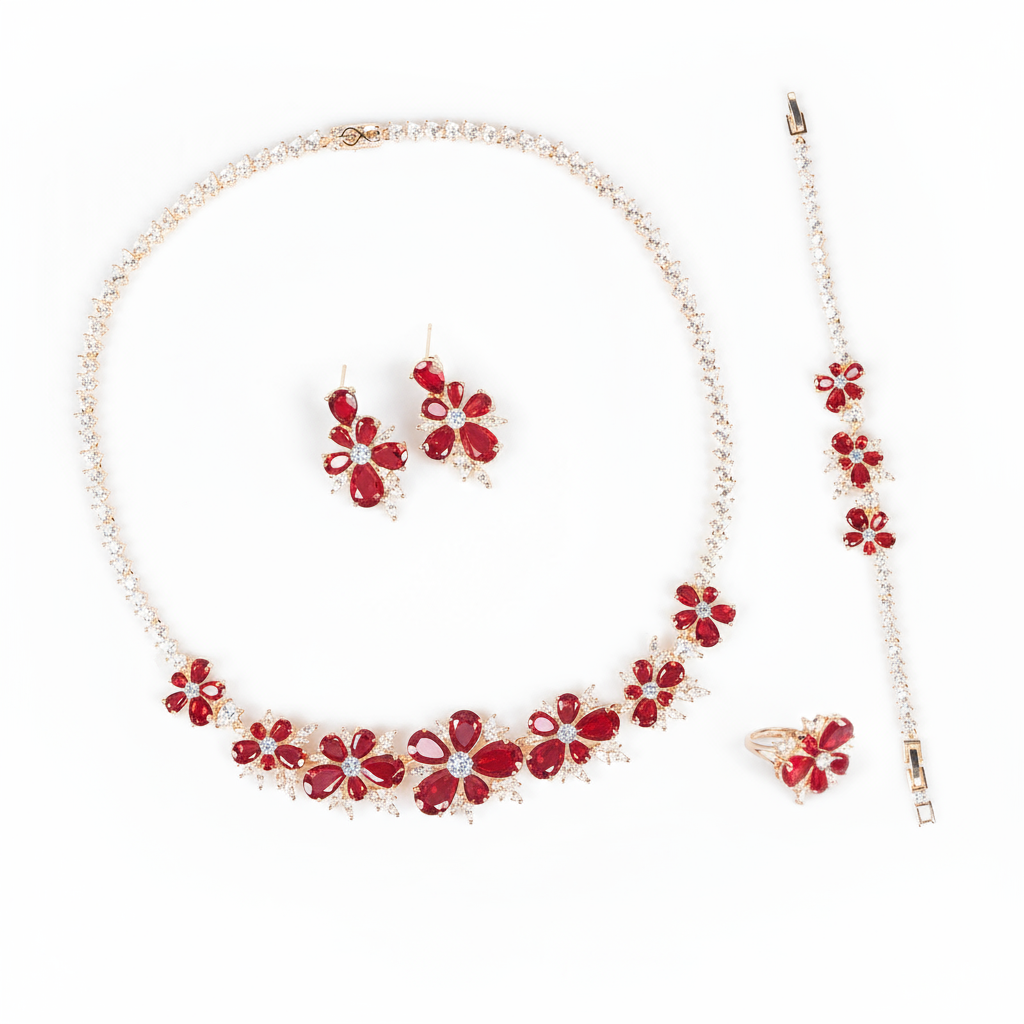 Elegant 14K Gold-Plated Copper Zircon Floral Jewelry Set with Red & Clear CZ Blossoms