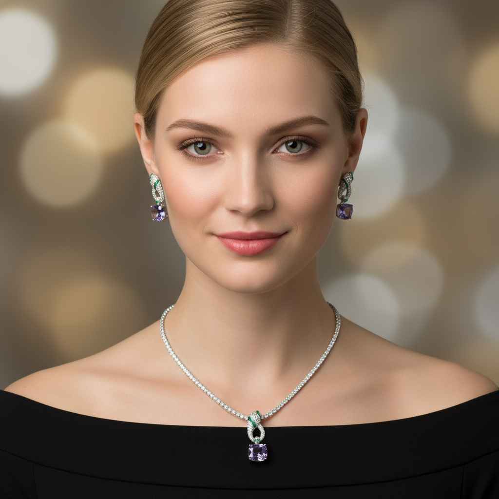 Elegant Rhodium-Plated Copper & CZ Jewelry Set with Amethyst and Emerald Accents