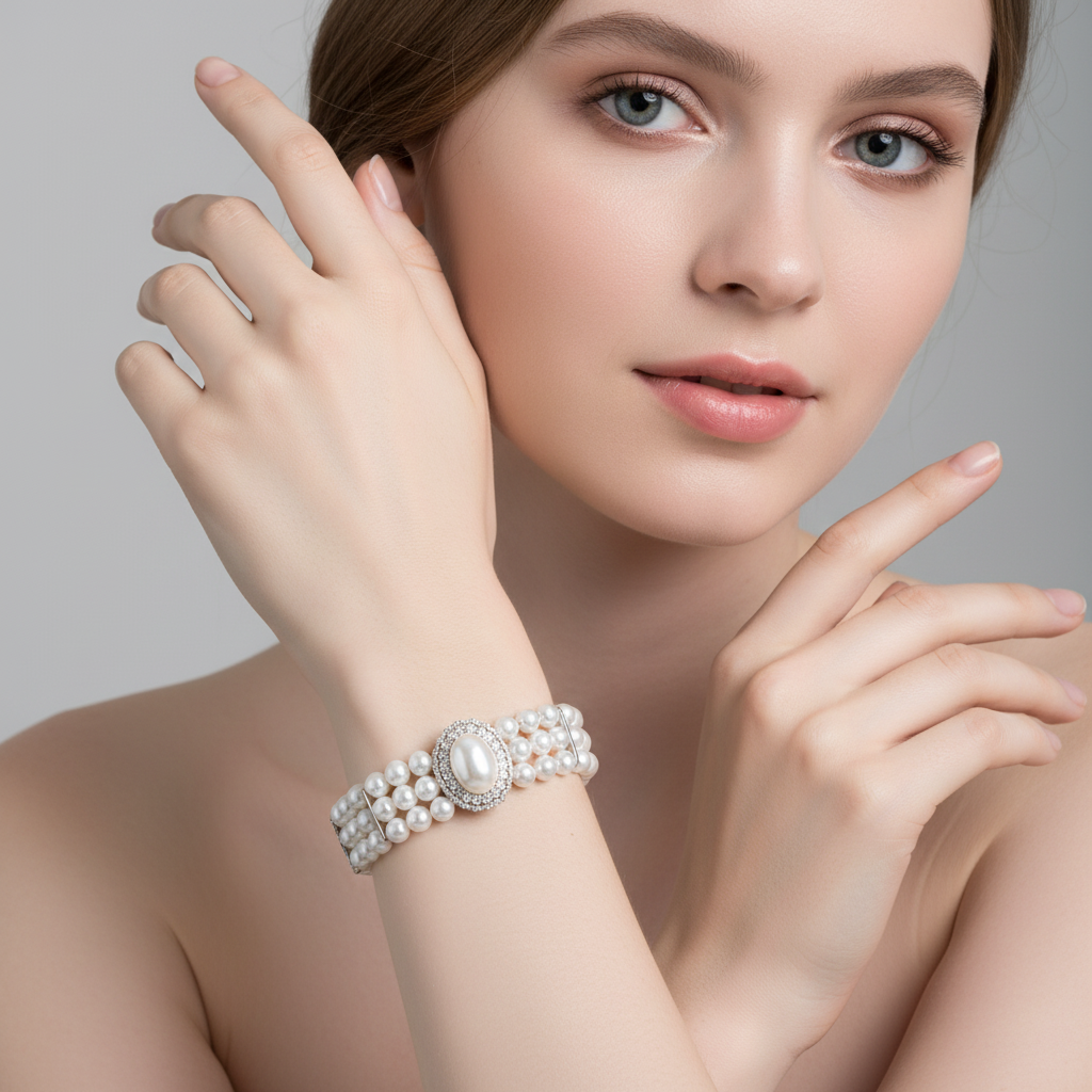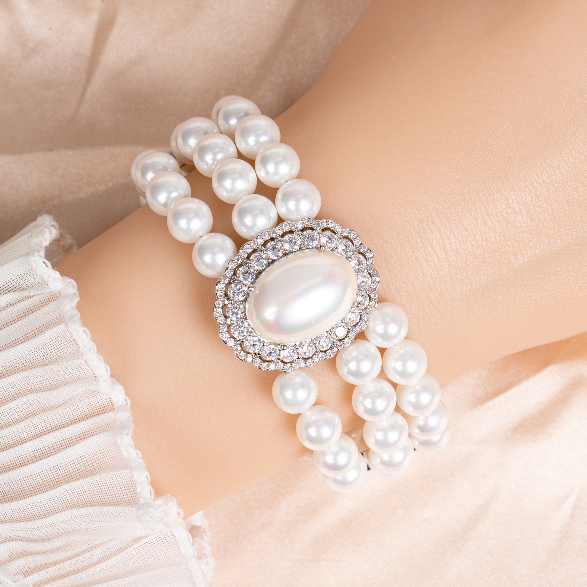 Triple-Layer Pearl Bracelet with Round Cubic Zirconia Halo & Adjustable Silver Clasp